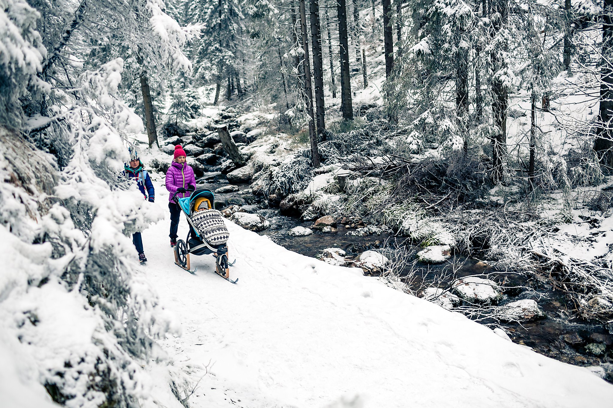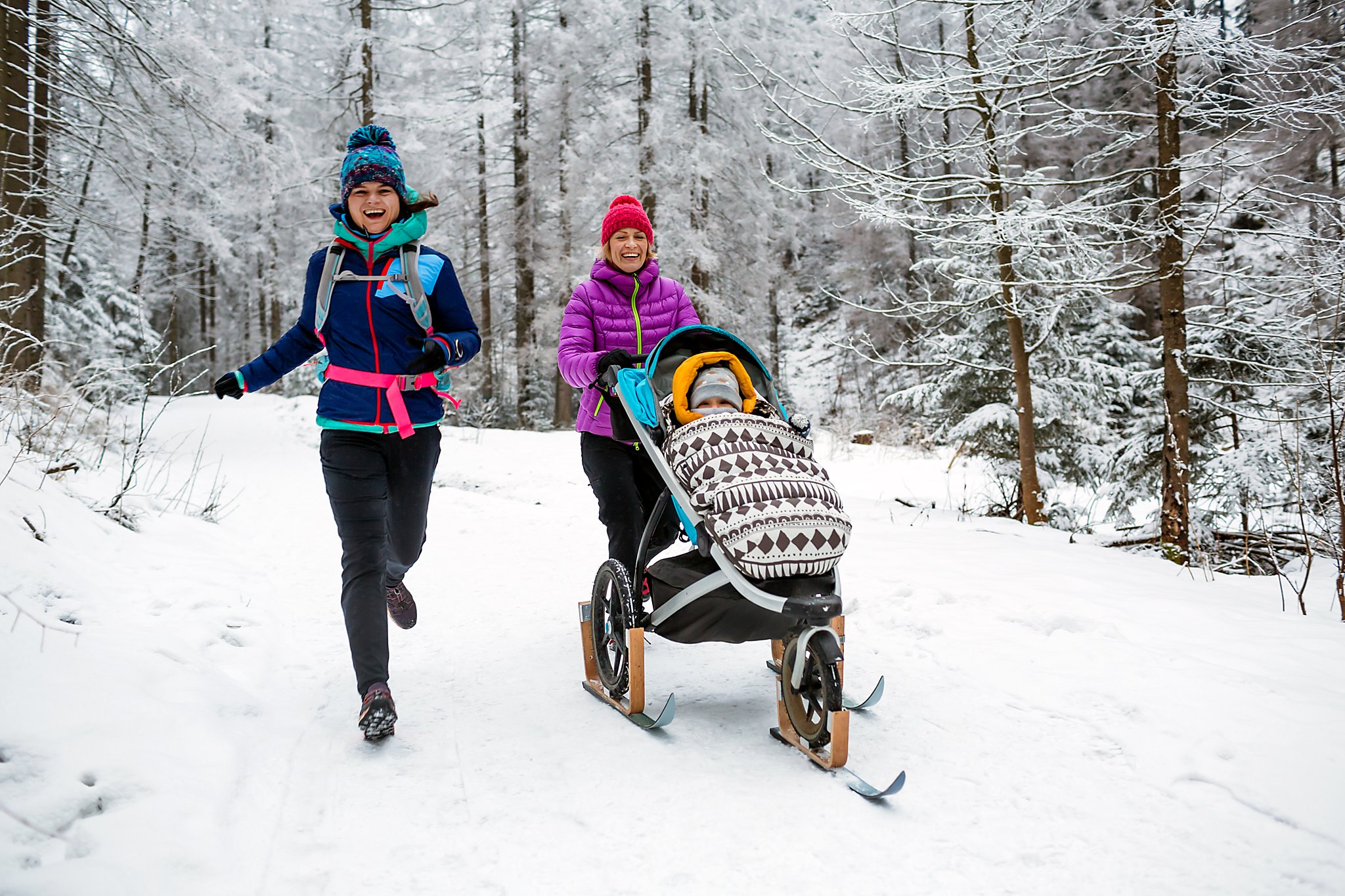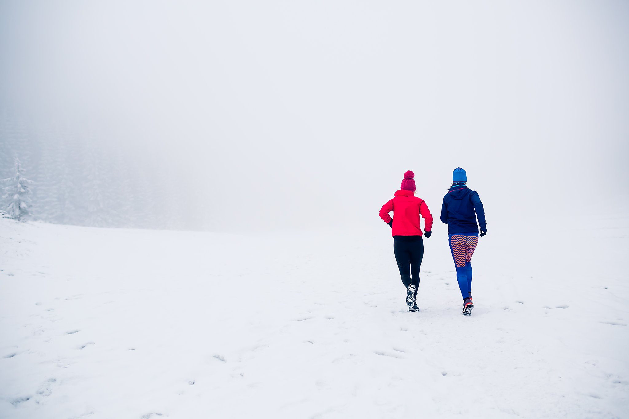 Zimowy trening biegowy w malowniczej scenerii Doliny Małej Łąki w Tatrach. Dwie biegaczki pokonują zaśnieżone szlaki w otoczeniu majestatycznych szczytów, ciesząc się pięknem zimowego krajobrazu i rześkim górskim powietrzem.